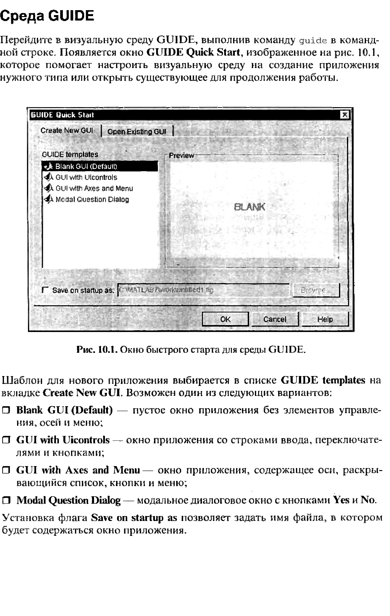Командалық жолдағы guide командасын орындау арқылы GUIDE визуальды ортасына өте аласыз. Сурет 10.1 көрсетілегендей GUIDE Quick Start терезесі пайда болады, ол бізге керекті типтегі қосымшаны жасау үшін немесе жұмысты ары қарай жалғастыру үшін визуальды ортаны баптауға көмек береді.