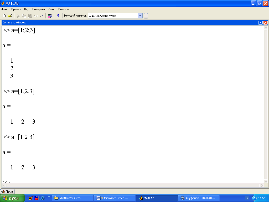 Ал, енді векторларды енгізуге келетін болсақ, командалар қатарында вектор атын көрсетіп, сосын = белгісін қоямыз да, квадратты жақшаны ашып, ішіне вектор элементтерін пробел немесе , таңбасы арқылы енгіземіз, сосын квадратты жақшаны жабамыз. Нәтиже жол түрінде шығады, ал егер элементтердің арасына ; таңбасын қойсақ нәтиже баған түрінде шығады. Мысалы, 3.1 суретке қарайық: