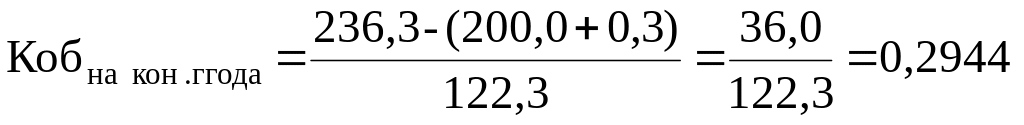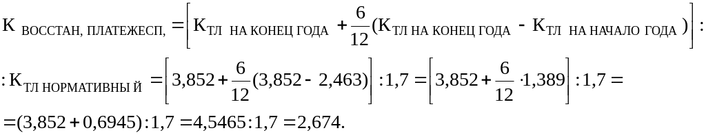 Нормативный коэффициент обеспеченности собственными средствами 0,3. Фактический коэффициент на конец года меньше норматива, (он равен 0,294), поэтому рассчитаем коэффициент восстановления платежеспособности: