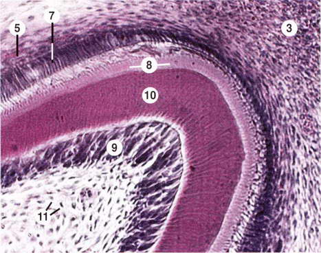 3. Заметим: дентин формируется раньше эмали, поэтому на некоторых препаратах виден только дентин (без лежащей снаружи эмали).