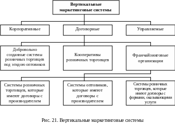 В этом случае один из членов канала либо является владельцем остальных, либо предоставляет им торговые привилегии, либо в силу своей мощи обеспечивает им полное сотрудничество. Это исключает дублирование усилий, укрепляет силу канала распределения, обеспечивает возможность реализации единого маркетингового плана.