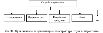 Функциональная организационная структура – это такой тип структуры службы маркетинга, в которой деятельность специалистов, отвечающих за выполнение определенных функций маркетинга, контролирует руководитель подразделения (рис. 30).