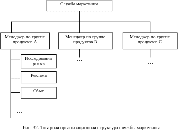 Товарная (продуктовая) организационная структура – это такая организация службы маркетинга, в которой за разработку и реализацию стратегий для определенного товара (товарной линии) отвечает менеджер по товару. При этом в подчинении каждого менеджера по товару находятся сотрудники, выполняющие все необходимые для данного продукта функции маркетинга (исследования, планирование продукта, сбыт и т.д.) (рис. 32). Менеджеры по товарам подчиняются руководителю службы маркетинга или непосредственно руководству компании. Все зависит оттого, насколько интегрирован маркетинг в организационную структуру управления фирмой.