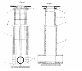 1 – плите днища, 2 – фундаментные блоки, 3 – кольцо колодца, 4 – плита покрытия, 5 – кольцо цилиндрической горловины, 6 – опорной кольцо, 7 – металлический люк