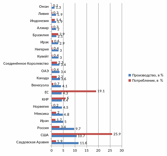 Мировым лидером по добыче нефти является Саудовская Аравия – более 1,2 млн. тонн/день. Мировым лидером по потреблению нефти являются США – более 2,6 млн. тонн/день. Чуть меньше потребляют страны Европейского союза – примерно 1,9 млн. тонн/день.