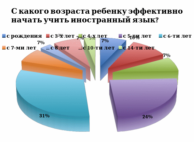 Второй раздел нашей первой анкеты был разработан специально для тех людей, у кого есть дети и кто имеет представление о будущем развитии своих чад. Мы хотели узнать у родителей, какой язык они бы выбрали для своего ребенка ( Диаграмма 9), а также возраст, с которого, по их мнению, для детей будет эффективным начать изучать иностранные языки ( Диаграмма 10).