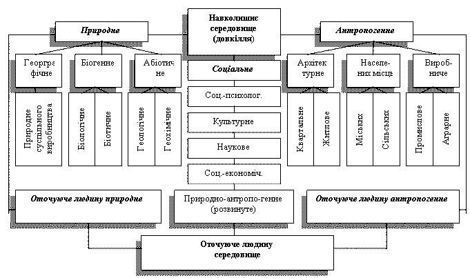 Хоча дослівний переклад терміну “екологія” означає “наука про середовище існування”, в більш конкретному, біологічному значенні, вона займається вивченням взаємовідносин між організмами та навколишнім середовищем. Це не вступає у протиріччя із сучасним більш широким трактуванням екології, як комплексної науки, яка досліджує середовище існування живих істот (включно з людиною, як біологічною істотою). У будь-якому випадку, поняття “середовище”, в усьому різноманітті його форм і видів, є провідним при розгляді проблем взаємодії живої природи та її оточення. Ось чому, в широкому спектрі сучасних екологічних досліджень, вчені-екологи змушені застосовувати багато різновидів поняття “середовище” в залежності від специфіки та напрямків своєї наукової діяльності. Зокрема, в соціальній екології при розгляді проблем “суспільно-природної взаємодії”, часто використовують згадки про наступні види (типи) середовища: зовнішнє, навколишнє, природне, антропогенне, географічне та інші. В зв’язку з цим виникає необхідність типології або класифікації (структуризації) поняття “середовища” з метою правильного вживання назв його різноманітних форм. В біології під поняттям “середовище” розуміють природні тіла та явища, з якими організм знаходиться в безпосередніх або опосередкованих взаємовідносинах. В більш широкому соціально-екологічному контексті це поняття трактується як сукупність природних (фізичних, хімічних, біологічних), природно-антропогенних (культурних ландшафтів) і соціальних чинників життя людини. В цьому значенні ми і будемо використовувати поняття “навколишнє середовище”, як синонім українського аналога англомовного поняття “environment” – довкілля. Поширене в літературі (переважно публіцистичній) поняття “оточуюче середовище”, яке дехто вважає синонімом поняття “навколишнє середовище”, слід використовувати з доповненням кого або що воно оточує. Наприклад, “оточуюче людину середовище”, “оточуюче підприємство середовище” або “оточуюче нас житлове середовище”, що буде більш правильним з точки зору семантики української мови. Надалі ми будемо розглядати провідне соціоекологічне поняття “оточуюче людину середовище” як аналог середовища існування (життєдіяльності) людини, розуміючи під ним цілісну систему взаємопов’язаних природних і антропогенних об’єктів і явищ, в яких проходять праця, побут і відпочинок людей. Вона включає в свій склад різноманітні природні, соціальні та штучно створені (антропогенні) чинники фізичного, хімічного та біологічного походження, що прямо чи опосередковано впливають на життя і діяльність людини. Виходячи з цього, ми пропонуємо розглядати наступні типи середовища (як навколишнього, так і оточуючого людину): природне, соціальне та антропогенне (мал.6). В структурі природного середовища, яке включає в себе усю сукупність навколишніх для людини (або іншої живої істоти) об’єктів живої та неживої природи ми пропонуємо розглядати наступні підтипи: абіотичне, біогенне та географічне. Усі їх складові, як ті, що не зазнали впливу людської діяльності, так і ті, що підпали під вплив антропогенних перетворень, але змогли зберегти здатність до саморозвитку (наприклад, лісові вирубки, перелогові землі, лише частково знищені популяції диких тварин тощо), слід охороняти від тех
