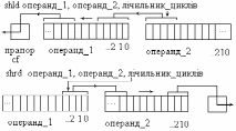 shld операнд_1, операнд_2, лічильник_зсувів – зсув вліво подвійної точності. Команда shld робить заміну шляхом зсуву бітів операнда операнд_1 вліво, заповнюючи його біти справа, бітами, що витісняються з операнда_2. Кількість зсовуваних бітів визначається визначається значенням лічильник_зсувів, яке лежить в діапазоні 0...31. Це значення може задаватися безпосередньо операндом або міститися в регістрі cl. Значення операнд_2 не змінюється.