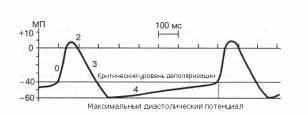 Диастолический потенциал неустойчив. В течение всей диастолы предсердий наблюдается его медленное спонтанное снижение. Этот процесс носит название медленной диастолической деполяризации (МДД) (4), в развитии которой принимают участие «медленные» кальциевые каналы, проницаемые, как для ионов кальция, так и для ионов натрия. И в течение всей диастолы идёт нарастающий ток кальция и натрия в клетку. При достижении критического уровня деполяризации (50мв), по одним данным активируются «быстрые» натриевые каналы, по другим достаточное количество “медленных” кальциевых каналов, и развивается фаза быстрой деполяризации ПД (0).