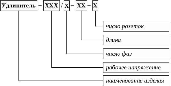 В условном обозначении изделия (Рисунок 7) содержится информация об его рабочем напряжении, длине и числе розеток (для удлинителей).