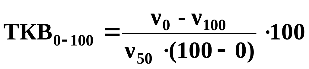 Однією із важливих властивостей масла, які характеризують експлуатаційні якості, є ступінь змінювання в’язкості в залежності від температури, тобто в’язкістно-температурна характеристика. В’язкістно-температурна характеристика оцінюється по температурному коефіцієнту в’язкості (ТКВ - 0 ÷ 100) по відношенню значення кінематичної в’язкості при 100 0С для масел МС-14, МС-22, а для масла МК-8 по відношенню значення кінематичної в'язкості при 500С. Температурний коефіцієнт масел в межах температур 00С і 1000С (ТКВ - 0 ÷ 100) підраховують за формулою: |