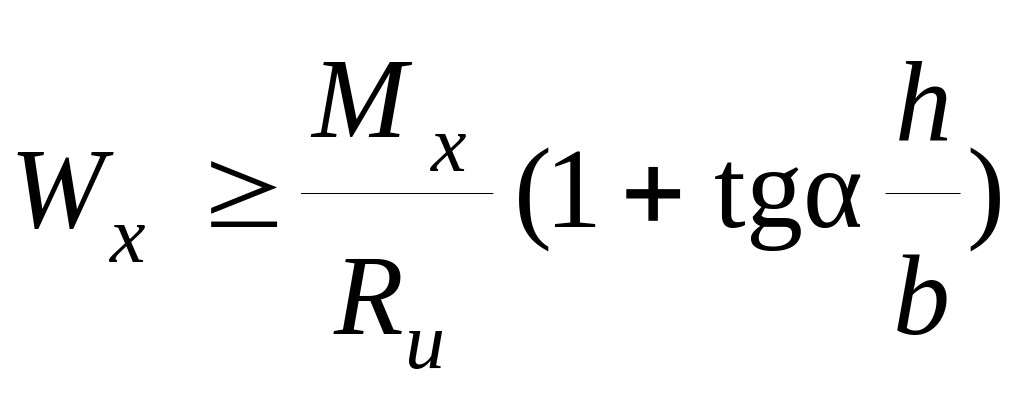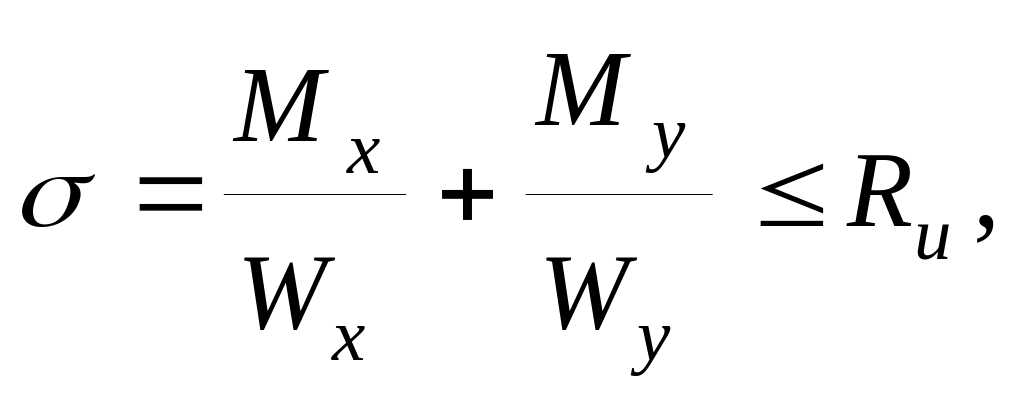 где Мх и Мy – составляющие расчетного изгибающего момента относительно главных осей x и y; Wx и Wy – расчетные моменты сопротивления поперечного сечения нетто для осей х и y; Ru – расчетное сопротивление изгибу.