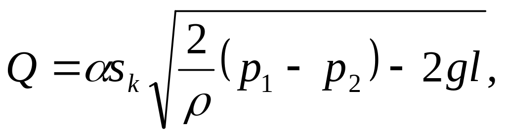 Если допустить, что k при всех расходах остается постоянной (с увеличением расхода увеличивается площадь кольцевого канала), то вся правая часть уравнения (1) будет постоянной, т.к. остальные величины для данного прибора тоже постоянны. Следовательно, разность давлений на поплавок p'1 - p'2=const, т.е. ротаметр является прибором постоянного перепада давления. Из совместного решения уравнений Бернулли и неразрывности получим уравнение расхода: