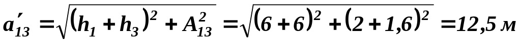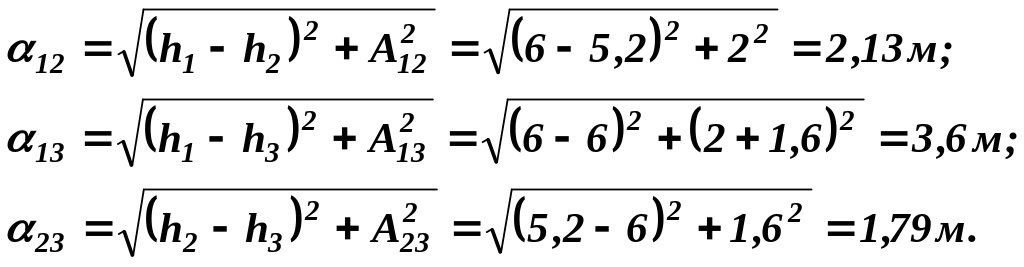 Найкоротші відстані між проводами у просторі рівні гіпотенузам прямокутних трикутників, де одним катетом є різниця висот підвісу проводів, а другим – відстань між проводами по горизонталі: