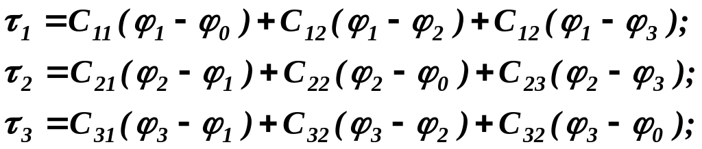 Шляхом аналогічного прирівнювання у других і третіх рівняннях систем (8.69) і (8.69, а) коефіцієнтів перед потенціалами , і , одержимо: