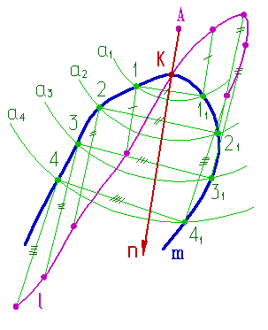 6. Пересечение кривых m и l определит положение точки К, через которую пройдет искомая нормаль n.