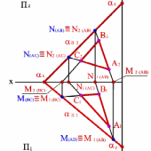 Каждый след плоскости является прямой линией, для построения которых необходимо знать две точки, либо одну точку и направление прямой (как для построения любой прямой). На рисунке 52 показано нахождение следов плоскости α(АВС). Фронтальный след плоскости αП2 построен, как прямая соединяющая две точки N(АС) и N(АВ), являющиеся фронтальными следами соответствующих прямых, принадлежащих плоскости α. Горизонтальный след αП1 – прямая, проходящая через горизонтальные следы прямых ВС и АВ. Профильный след αП3 – прямая соединяющая точки (αy и αz) пересечения горизонтального и фронтального следов с осями. Точки αx, αy и αz называют точками схода следов.