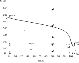 7) состав и массу твердой и жидкой фаз, которые образуются при охлаждении жидкого расплава от начальной температуры 880 0С до температуры 415 0С; масса расплава - 215 г, его первоначальный состав - 42% Sn и 58% Al;