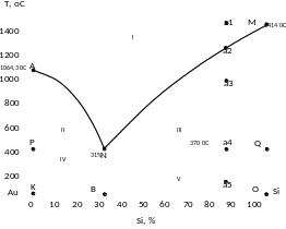 7) состав и массу твердой и жидкой фаз, которые образуются при охлаждении жидкого расплава от начальной температуры 1200 0С до температуры 600 0С; масса расплава - 220 г, его первоначальный состав - 73% Si и 27% Au;