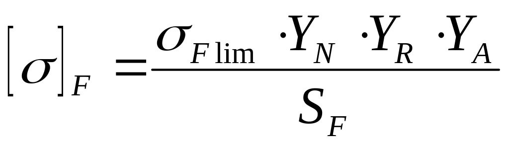 Допускаемые напряжения изгиба []F1 для шестерни и []F2 для колеса определяют по общей зависимости (но с подстановкой соответствующих параметров для шестерни и колеса), учитывая влияние на сопротивление усталости при изгибе долговечности (ресурса), шероховатости поверхности выкружки (переходной поверхности между смежными зубьями) и реверса (двухстороннего приложения) нагрузки: