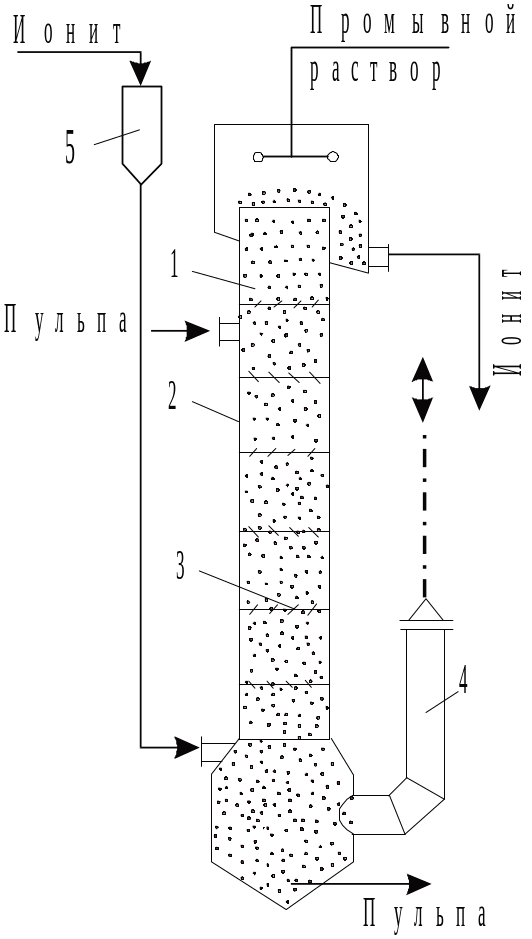 ПСК-Р работает в режиме свободного осаждения ионита (рис. 11). Ионит подается в колонну сверху и свободно осаждается в восходящем потоке раствора. Скорость движения частиц ионита равна 0,4 – 0,6 от скорости осаждения ионита в спокойном растворе. Ионит выводится из нижней части колонны с помощью аэролифта. Объемная доля ионита (задержка ионита) в колонне не превышает 20 %. Частота пульсаций 60 – 120 мин-1. Время пребывания ионита составляет 2 – 3 минуты на погонный метр, высота, эквивалентная теоретической ступени обмена составляет 2 – 4 м. Колонна пригодна для осуществления быстротекущих процессов сорбционно-десорбционного цикла со временем установления равновесия 30 – 60 мин.