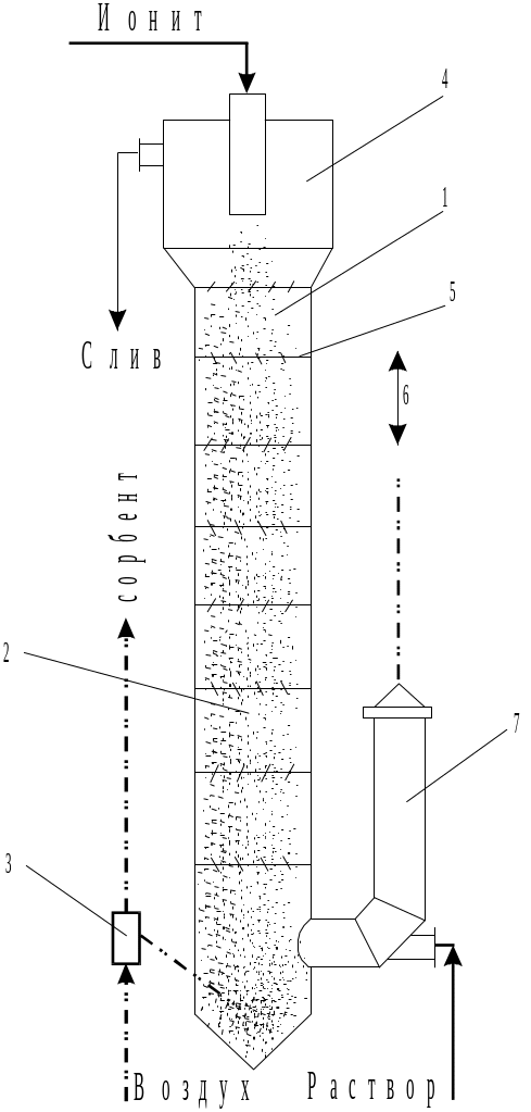 Рис. 11. Колонна ПСК-Р: 1 – корпус; 2 – взвешенный слой сорбента; 3 – аэролифт;