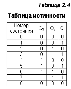 Шығыста нолдік деңгеймен анықталатын бастапқы қабылданған күй ретінде Q1 = Q2 = Q3 = 0 . Келесі импульс қосылған кезде санағыштың берілгеніне бір саны қосылады.2-кестеден ең кіші, бірінші разрядтан триггер өзінің күйін келесі импульс санағының келуімен өзгеріп отыруы керек