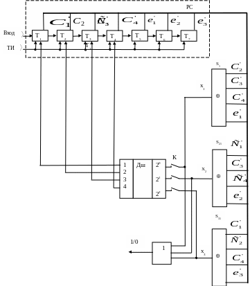 Принимаемая кодовая комбинация тактовыми импульсами ТИ последовательно вводится в сдвиговый регистр РС. По окончании ввода на выходах сумматоров по модулю два S1-S3 образуется синдром X =(x1,x2,x3). Если хотя бы один элемент синдрома не равен нулю, то на выходе схемы ИЛИ образуется логическая единица, являющаяся признаком ошибки в принятой кодовой комбинации.