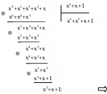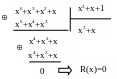 Пример: Пусть полученная комбинация 1001110 совпадает с переданной, т.е. искажений нет. Известно, что комбинация образована с помощью образующего полинома G3(x)=x3+x2+1. В результате деления полинома, описывающего эту комбинацию на образующий полином G3(x) получаем: