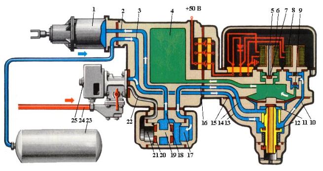 Число кратковременных возбуждений катушки вентиля 8 определяет число ступеней торможения, а их длительность — величину давления ступени (минимальная ступень 0,2 кгс/см2).