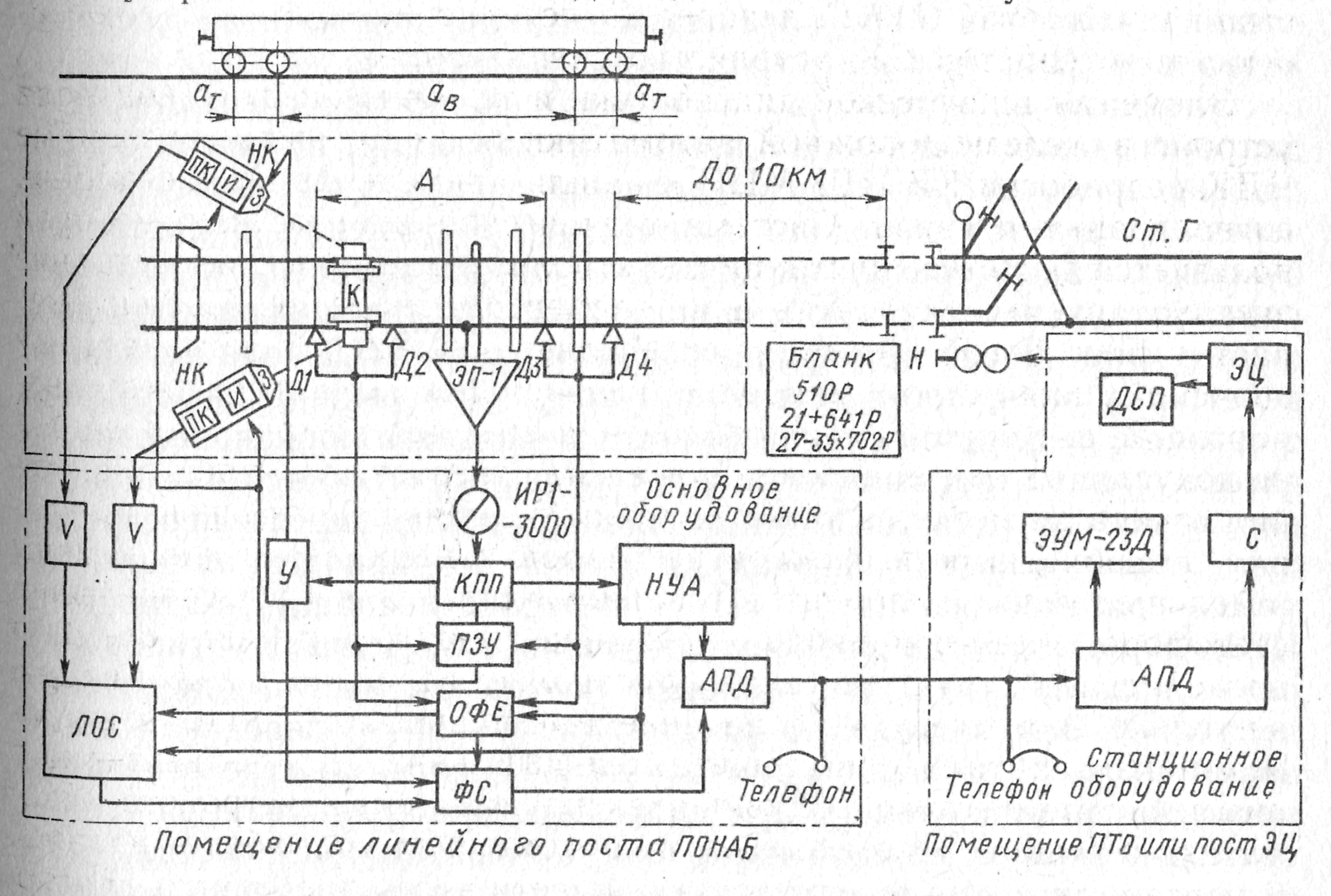 Логическое устройство ОФЕ запоминает отдельно число осей передней и задней тележек, прошедших над датчиками Д1 и ДЗ, фиксирует момент, когда зона между Д1 и ДЗ освобождается от базы подвижной единицы, сравнивает для достоверности информации число осей задней тележки, зарегистрированных каждым из датчиков, с числом осей передней тележки. Моменты совпадения числа осей задней и передней тележек, зарегистрированные каждым из датчиков Д1 и ДЗ, определяют моменты завершения проходов над ними последних колесных пар физических единиц подвижного состава. Устройство ОФЕ вырабатывает импульсы счета подвижных единиц, поступающие на устройство логической обработки сигналов ЛОС для считывания с его ячеек памяти информации, принятой от напольных камер НК, и на формирователь сигналов ФС для передачи через аппаратуру передачи данных АПД сведений о состоянии буксовых узлов поезда на приборы сигнализации С и электроуправляемую печатающую машинку ЭУМ-23Д с дешифратором двоичного кода. После дешифрации принятого от АПД кода на бланке печатается знак, соответствующий коду. При выдаче информации о вагоне с перегретой буксой сначала печатается порядковый номер вагона и знак стороны поезда, а затем данные об общем числе вагонов в поезде (два десятичных знака), общем числе перегретых букс (один десятичный знак) и знаки исправности аппаратуры («Р» – работоспособна и «Н» – неработоспособна). Устройства ПОНАБ находятся в рабочем состоянии с момента шунтирования реле типа ИР1-3000 до удаления поезда от места подключения педали ЭП-1 к рельсам на расстояние 40-50 м, передавая в это время на пост ДСП или в помещение ПТО сигналы «тревоги» и отметки подвижных единиц. При проходе поезда сравниваются амплитуды сигналов от каждой пары букс данной стороны поезда. Если отношение сигналов превысит заданное пороговое значение, то букса считается аварийно-греющейся и ЛОС выдает сигнал «тревоги».