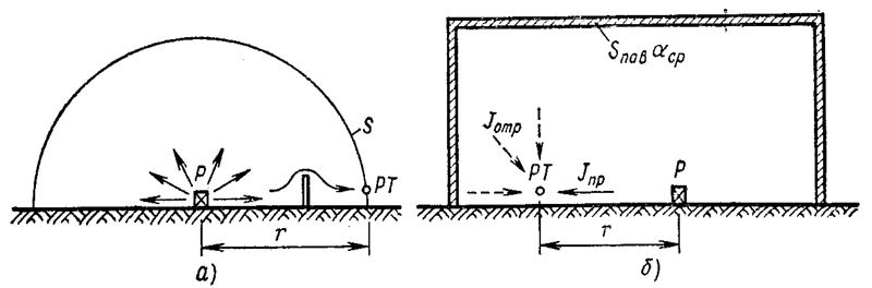 Інтенсивність звуку J у розрахунковій точці (рисунок 4.1 б) складається з інтенсивності прямого звуку Jпр, що йде безпосередньо від джерела, і інтенсивності відбитого звуку Jвідб