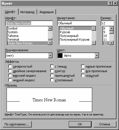 В диалоговом окне Шрифт присутствуют три вкладки: Шрифт, Интервал, Анимация. На вкладке Шрифт выбирают атрибуты шрифта. Вид шрифта при разных настройках оформления (Начертание, Размер, Подчеркивание, Цвет и Эффекты) контролируется в области предварительного просмотра Образец.