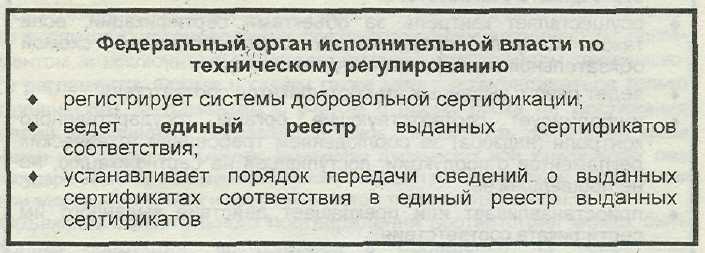 Ведет единый реестр зарегистрированных систем добровольной сертификации федеральный орган исполнительной власти по техническому регулированию. Реестр содержит сведения о юридических лицах и (или) об индивидуальных предпринимателях, создавших системы добровольной сертификации, о правилах функционирования указанных систем, о знаках соответствия и порядке их применения. Федеральный орган исполнительной власти по техническому регулированию должен обеспечить доступность сведений, содержащихся в едином реестре зарегистрированных систем добровольной сертификации, заинтересованным лицам, Порядок ведения единого реестра зарегистрированных систем добровольной сертификации и порядок предоставления сведений, содержащихся в этом реестре, устанавливаются федеральным органом исполнительной власти по техническому регулированию. Регистрация системы добровольной сертификации осуществляется в течение пяти дней с момента представления в федеральный орган исполнительной власти по техническому регулированию требуемых документов.