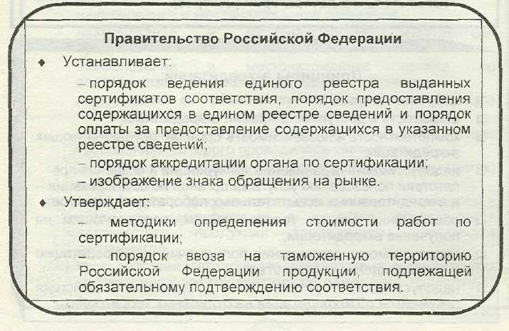 Участие государства в процессе сертификации выражается через деятельность Правительства Российской Федерации и Федерального органа исполнительной власти по техническому регулированию.