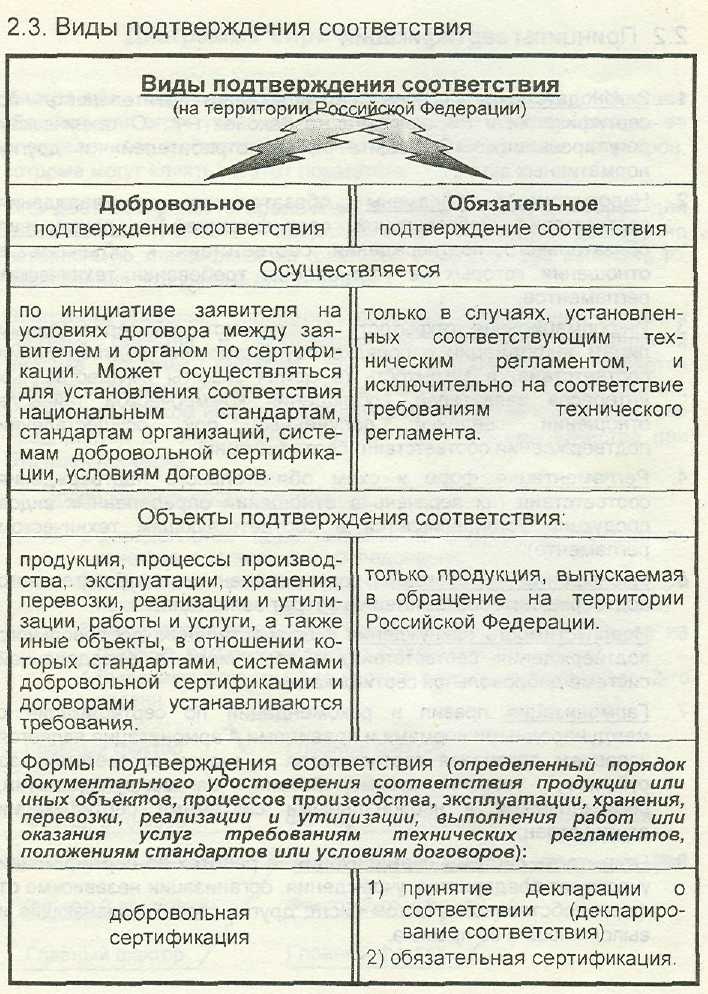 Обязательное подтверждение соответствия осуществляется только в случаях, установленных соответствующим техническим регламентом, и исключительно на соответствие требованиям технического регламента. Форма и схемы также могут устанавливаться только техническим регламентом с учетом степени риска не достижения целей технических регламентов (риск - вероятность причинения вреда жизни или здоровью граждан, имуществу физических или юридических лиц, государственному или муниципальному имуществу, окружающей среде, жизни или здоровью животных и растений с учетом тяжести этого вреда). Объектом обязательного подтверждения- соответствия может быть только продукция, выпускаемая в обращение на территории Российской Федерации.