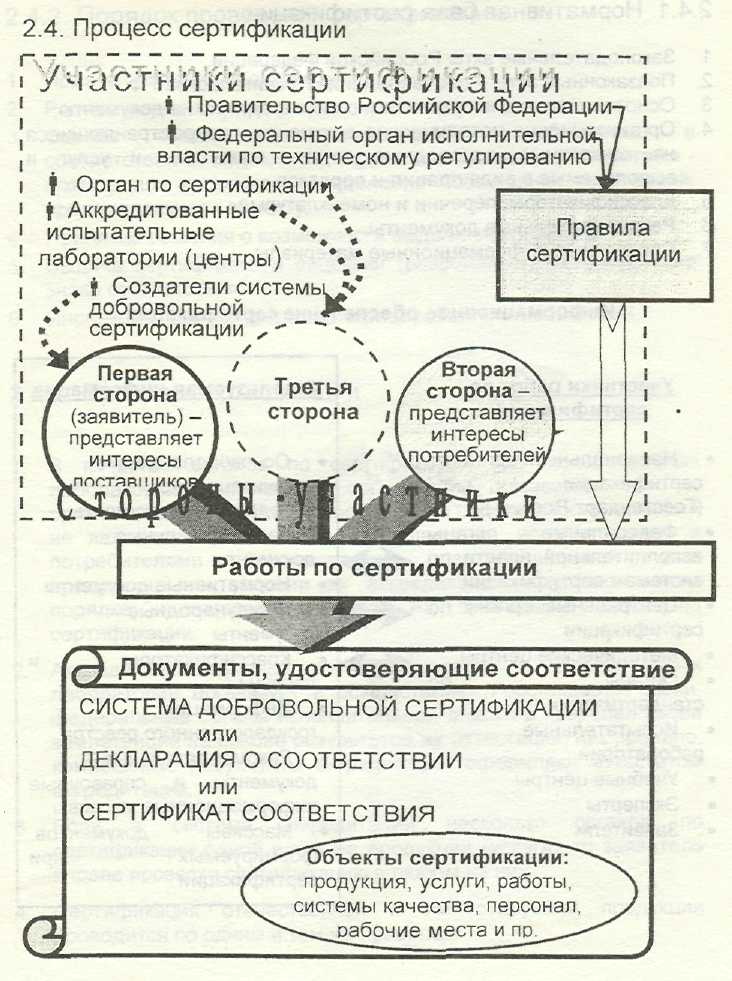 В процессе сертификации участвующие стороны представляют, как правило, интересы поставщиков и покупателей. Первая сторона - заявитель - представляет интересы поставщиков. Вторая сторона, согласно закону «О техническом регулировании», непосредственно в процессе сертификации не участвует, но ее присутствие подразумевается. Например, в числе целей подтверждения соответствия, указанных в законе, - содействие приобретателям в компетентном выборе продукции, работ, услуг. Третья сторона - лицо или орган; признаваемые независимыми от участвующих сторон в рассматриваемом вопросе: органы по сертификации, испытательные лаборатории (центры), специально уполномоченные федеральные органы исполнительной власти. Ее участие в сертификации предусмотрено лишь в случае, если отсутствие третьей стороны не приводит к достижению целей подтверждения соответствия.