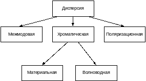 Хроматическая дисперсия состоит из материальной и волноводной составляющих и имеет место при распространении как в одномодовом, так и в многомодовом волокне( рисунок 2.12 ). Однако наиболее отчетливо она проявляется в одномодовом волокне из-за отсутствия межмодовой дисперсии.