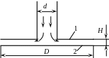 Задача 2.1.9. Жидкость вытекает из трубы с диаметром d, на конце которой укреплена круглая шайба 1 диаметром D (рис. 2.6). На расстоянии H = d/4 от шайбы помещен диск 2 того же диаметра D. Жидкость, выходящая из трубы растекается радиально между двумя плоскостями и затем выходит в атмосферу. Расход и плотность жидкости заданы. Найти закон изменения давления вдоль радиуса диска, считая жидкость идеальной. Принять течение радиальным и безотрывным.