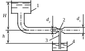 Задача 2.1.6. Уровень воды в водонапорном баке 1 превышает уровень воды в трубопроводе на величину Н = 2 м (рис. 2.4). Вода течет по трубопроводу диаметром d1 = 50 мм. На трубопроводе имеется сужение 2 диаметром d2 = 40 мм, к которому присоединена трубка 3, опущенная в резервуар 4. Уровень воды в резервуаре 4 ниже уровня воды в трубопроводе на величину h = 1 м. Определить направление движения воды в трубке 3. Трением пренебречь.