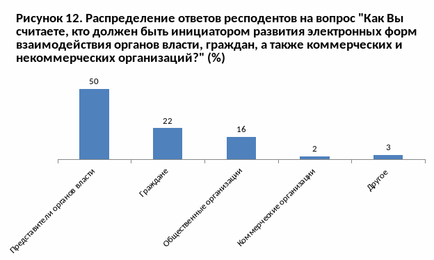 На вопрос о том, кто должен быть инициатором развития электронных форм взаимодействия органов власти, граждан, а также коммерческих и некоммерческих организаций, большинство респондентов отметили вариант «представители органов власти» (50%), вариант «общественные организации» и «граждане» выбрало примерно равное количество респондентов (16 и 22 % соответственно). (Рис. 12)