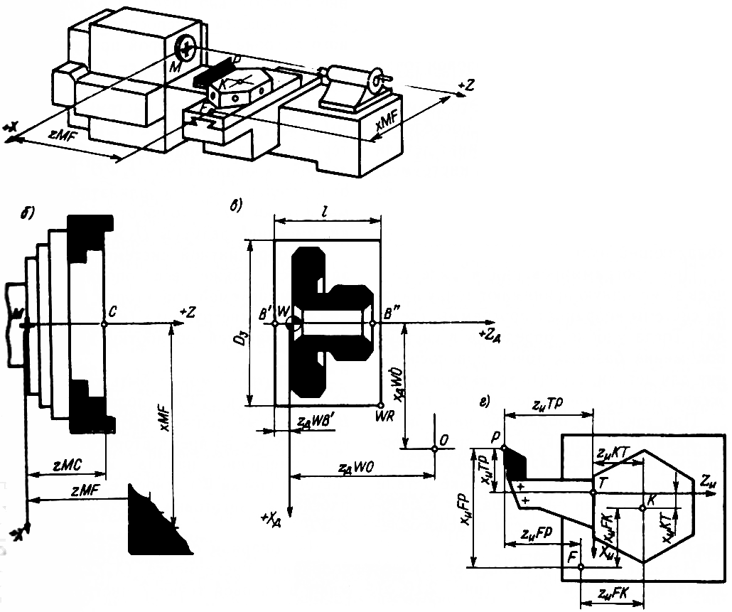 Таким образом, при обработке детали, например, на токарно-револьверном станке с ЧПУ (рис. 1.3.8,а) можно выделить три координатные системы.