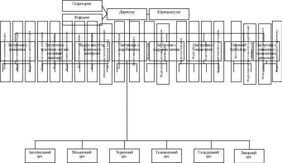 На рис. 6.15 для прикладу представлена організаційна структура управління підприємством середніх розмірів, яка має певні типові риси різних організацій (для спрощення схеми на малюнку показані тільки лінійні зв'язки). Очолює підприємство директор (генеральний директор, президент, голова правління та т.п.), в підпорядкуванні якого знаходяться заступники (виконавчі директори, віце-президенти та т. п.), що формують перший рівень управління.