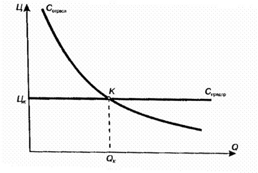 На рис. 20.1 представлены две кривые спроса. Одна из них Cотрасл выражает зависимость изменения величины общего спроса от динамики цен на отдельном отраслевом рынке, другая кривая Cпредпр представляет совершенную эластичность спроса на данный вид продукции для отдельно взятого предприятия. Горизонтальное положение данной кривой указывает на отсутствие возможности у отдельного предприятия влиять на изменение рыночной цены. Данное обстоятельство вызвано тем, что сколько бы ни расширяло предприятие выпуск продукции, его доля на рынке остается недостаточной для того, чтобы повлиять на цену, вызвать ее изменение. Поэтому и кривая спроса, располагаясь горизонтально, свидетельствует о том, что цена спроса для предприятия является постоянной и заданной рынком величиной.