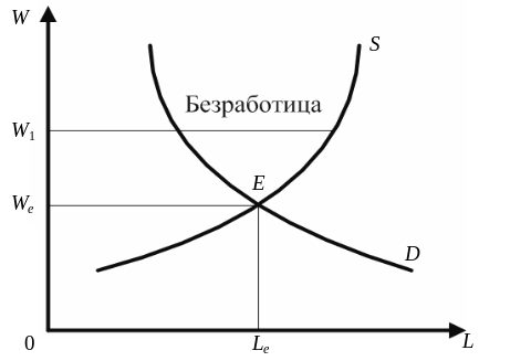 Равновесие на рынке труда (рис. 5.4) достигается в точке пересечения спроса (DL) и предложения труда (SL) и характеризует установление равновесной ставкизаработной платы (We) и равновесного уровня занятости (Le). Если заработная плата устанавливается выше равновесной (W1), то на рынке труда имеет место избыток работников, который означает безработицу.