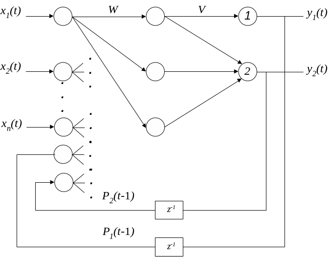 Под рекуррентной сетью понимается такая сеть, в которой значения выходных сигналов сети в момент времени t зависят от значений этих сигналов в предыдущий момент времени.