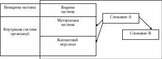 Модель П. Эйглие й Е. Лангеарда. Ця модель маркетингу послуг була розроблена в 1976 р. у Франції професорами школи бізнесу при Марсельському університеті. Модель, що П. Эйглие й Е. Лангеард назвали «сервакшн», або «обслуговування в дії», показана на мал. 2. Модель підкреслює не тільки одночасність виробництва і споживання послуги, але і її невідчутність. Якщо модель Ратмела лише позначила необхідність уваги до процесу взаємодії продавця і покупця як нову функціональну задачу маркетингу, то «сервакшн»-модель як би мікроскопічно показує нам те, що, власне, відбувається в цьому процесі. Ключовими факторами в цій моделі є: 1) сам процес обслуговування, охоплений великим квадратом; 2) організація послуг, позначена малим квадратом; 3) споживач А; і 4) споживач Б.