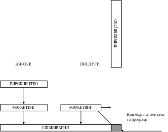 Як показано на мал. 1, у контексті послуг досить важко розділити виробництво, маркетинг і споживання послуг на окремі процеси. Це обумовлено специфікою послуги як продукту, на яку модель Ратмела робить головний акцент. Процеси виробництва і споживання послуг одночасні. У той момент, коли послуга виробляється, у цей же момент вона і споживається. Звідси випливає нова функціональна задача маркетингу в сфері послуг на додаток до традиційних функціональних задач маркетингу. Виникає необхідність вивчати, створювати, оцінювати, рекламувати, просувати на ринок і продавати процес взаємодії між тими, хто робить послугу, і тими, хто неї споживає. На мал. 1 ця задача позначена додатковою стрілкою.