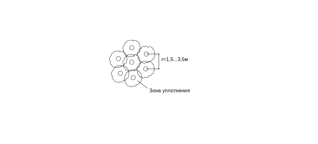 Сваи размещают обычно в шахматном порядке с пересечением зон уплотнения.