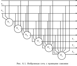 Типовая структура НС с прямыми связями представлена на рис. 6.1.Такие нейронные сети - наиболее часто используемый вид НС. К ним относятся, например, разнообразные варианты ПЕРСЕПТРОНА.